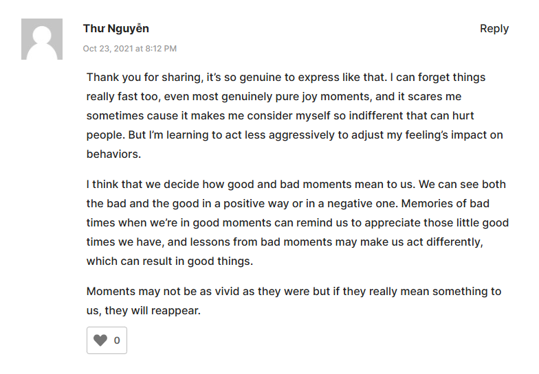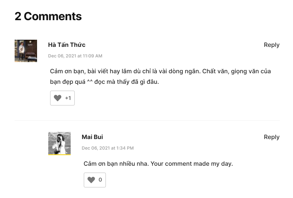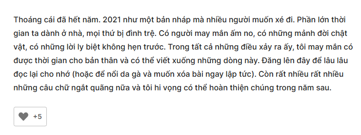 Ở nền tảng mới này, giao diện blog đơn giản hơn nhiều, sẽ không còn nút tim và comment. Mình khá tiếc nhưng giờ chúng cũng không còn cần thiết lắm, và mình có thể tìm cách thêm chúng sau này. Bù lại là tốc độ được cải thiện đáng kể, dễ dàng cập nhật các bài viết hơn, và vẫn giữ được giao diện khá gọn gàng.
